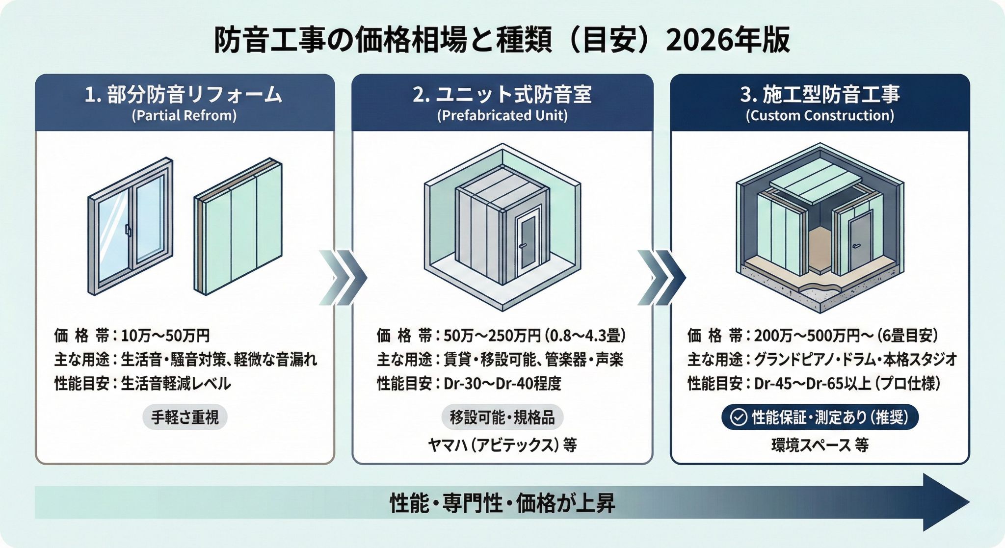 {費用相場としては部屋の広さや防音レベルにより大きく変動します|費用目安は空間規模と防音強度により多様です|見積もりは室内面積及び遮音度で変